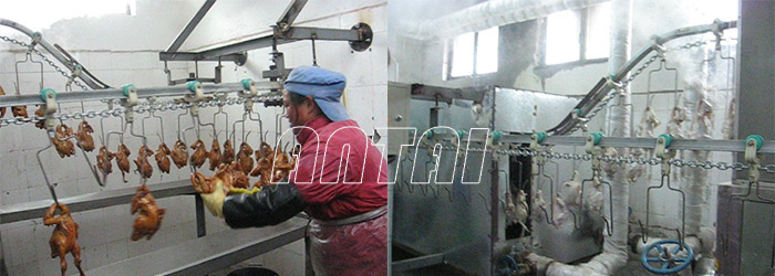 懸掛油炸雞線采用鏈條吊掛傳送系統(tǒng),有六個工作區(qū)分別有雞掛線區(qū)、上糖區(qū)、瀝糖區(qū)、油炸區(qū)、瀝油風冷區(qū)、下線區(qū);懸掛方式有掛鉤是和炸框’式。